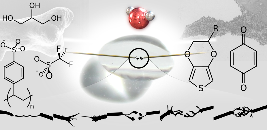 Abstract: Over the past few years, organic electronics - and especially organic mixed ionic electronic conductors (OMIECs) - has taken bio sensing and neuromorphic applications to a whole new level. However, one of the major limitations of the mainstream technolog ies today is that electronic circuits need to be pre-shaped according to the intended use and the expected outcome. This top-down approach, far from being flexible/adaptive, does not really make the most of the resources at hand, as it is hard to predict precisely where cells will be located. To counter that, we can either choose to increase the density and the number of electrodes, so that the entire area would be mapped, or shift from a top-down to a bottom-up approach which would allow for a more enl ightened decision-making process. Recently, the electrodeposition of PEDOT:PSS has been explored as a novel technique to grow conducting polymer films and fibers on non-conductive substrates. The work of Janzakova and coworkers took that concept a step f urther by using electropolymerization of EDOT as a way to create freestanding dendritic-like conductive fibers in a 3D environment, paving the way for in operando material modification, and in fine bottom-up fabrication routes that would be more adaptive and allow for more flexibility. Moreover, it was lately showed that these objects could work as Organic Electrochemical Transistors (OECTs). Here, we explore the possibility of growing dendritic-like PEDOT fibers on Multielectrode Arrays (MEAs) via elec tropolymerization of EDOT. Electrophysiological measurements are based on the capacitive coupling between cells and the electrode material. In comparison with local electrodes, the dendritic objects present spatially distributed impedance due to the exte nsions of their dendritic branches interacting with the biological environment. We investigate the relation between morphology and impedance in these dendritic-like fibers by using a non-conventional Electrochemical Impedance Spectroscopy (EIS) setup tha t will allow us to apply a potential difference between the two ends of the dendrites, thus studying how biasing them can affect their behavior. Moreover, it appears that dendritic fibers can be considered both as passive electrodes as well as active dev ices. We explore the use of these two strategies in the context of electrophysiological measurements. Finally, the ability to record biological signals results from the interaction between cells and an electrode. Unconventional objects such as dendrites present spatio-temporal filtering properties that could affect the recording of such signals. We investigate how tuning the impedance of a dendrite might be used to record efficiently bio-signals.