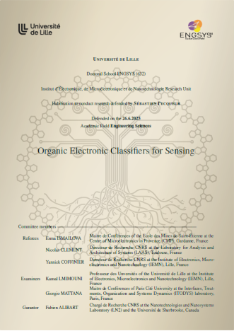 Abstract: This monograph describes nine years of research carried out at the Institute for Electronics, Micro-electronics and Nanotechnologies (IEMN), developed around defining a generic concept for detection, filling a void between metrological sensors and biolog ical senses, sensing an environment's qualities along with their measurable properties in information generation technologies. The first chapter introduces fundamental notions of recognition for complex environments, such as for their chemistry, for whic h organic semiconductors can embed two new functionalities in consumer electronics. The second and third chapters mostly summarize contributions to the state-of-the-art literature on these matters: in the second chapter, on studying conducting polymers a s both chemical detectors and conductimetric transducers, and the third chapter, on studying electropolymerization sensitivity to conceptualize evolutionary electronics. The fourth chapter presents several results on the conception of several "classifier s" exploiting both functionalities: in tasks aiming at integrating different sensitivities at a very small scale, at broadening sensing devices' receptive fields based on experience, and at physically engraving the experience data in a sensing hardware. Along with this monograph are also associated four appendices, summarizing different elements related to the context of this research.
